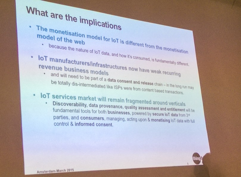 De lijst met databronnen bij Thingful is nu nog enigszins beperkt, en loopt uiteen van zenders in zeeschildpadden van The Sea Turtle Conservancy tot weergegevens van de Franse thermostaten- en weerstationsmaker Netatmo. Twee van de lessen die mij bijgebleven zijn van de presentatie van Khawaja: Ten eerste het business model bij IoT. Dat is wezenlijk anders dan bij internet, omdat IoT-data een heel andere aard hebben en omdat consumenten deze data op een andere manier tot zich nemen. Veel bedrijven in de sector hebben nog niet goed uitgevogeld hoe ze deze data te gelde kunnen maken. Een tweede les, die gaat over de auto-industrie. Khawaja: “Auto’s zitten vol met chips. Autofabrikanten zitten op een data-goudmijn, maar ze weten totaal niet hoe ze daar mee om moeten gaan. Ze zijn als de dood om straks alleen nog maar leveranciers van rijdend metaal te zijn. Maar de omschakeling maken naar IoT-data-analyse, daar zijn ze nog nauwelijks mee begonnen.”